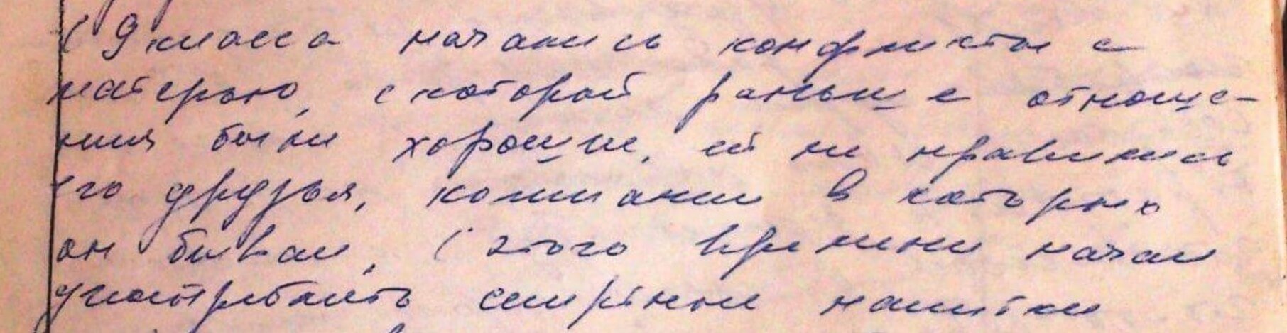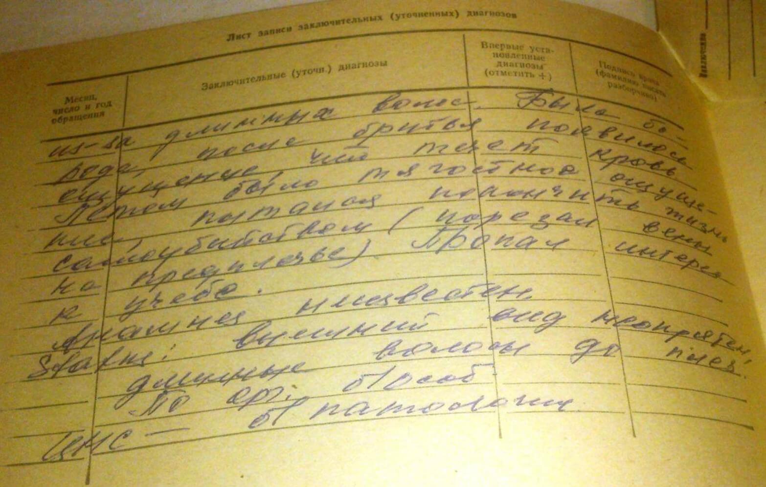 Starting in the autumn of 1973, he began hanging out with various groups of people, sometimes coming home drunk. Once he told his mother that he had taken several seduxen pills to achieve a ‘pleasant blackout.’ During the winter session, after the first exam, he was very upset. One day, he started shouting, saying that he couldn’t take it anymore, and that his sister was saying bad things about his girlfriend. He fell to the floor and cried. After his mother’s remark, he got up, took a pill of luminal, and went to the table. He began to cut his arm with a razor, then called one of his female friends, said goodbye to her, lay down for a while, got up, and began to eat lunch. When the girl he called arrived, she said that his girlfriend often had the same hysterics at home. His mother considers him malleable; she believes he became confused by his friends and lies. At that, his mother considers him healthy and believes he can serve in the army.