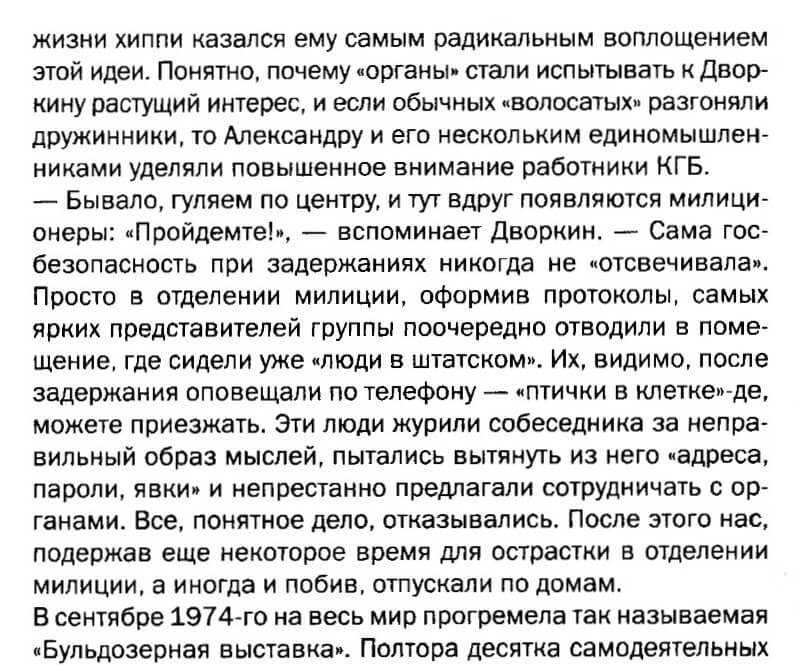 “The hippie lifestyle seemed to him to be the most radical embodiment of this idea. It’s understandable why the authorities began to take a growing interest in Dvorkin, and while ordinary ‘longhairs’ were dispersed by citizen patrols, Alexander and his few like-minded friends were given special attention by KGB agents.