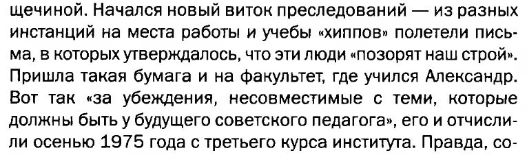 “A new round of persecution began: letters flying in from various authorities to the places of work and study of the ‘hippies,’ claiming that those people were ‘disgracing our order.’ Such a letter also arrived at the faculty where Alexander was studying. Thus, ‘for beliefs incompatible with those that a future Soviet teacher should have,’ he was expelled from the institute in the fall of 1975, in his third year of studies.”