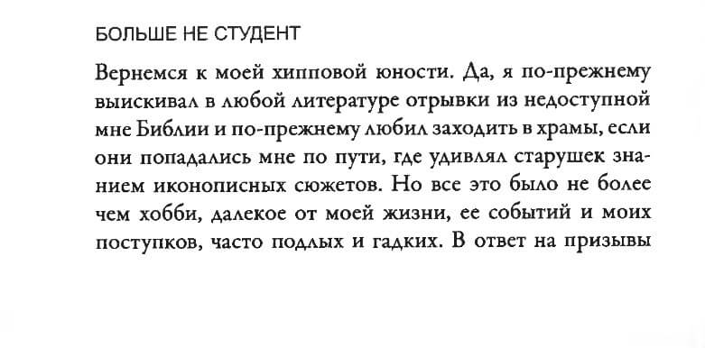 “Let’s return to my hippie youth. Yes, I still picked out passages from the Bible, inaccessible to me, in any literature, and I still loved to visit churches if I came across them on my way, where I surprised old women with my knowledge of the scenes depicted in the icons. However, all of this was nothing more than a hobby, far removed from my life, its events, and my actions, which were often despicable and nasty. In response to the pleas of my mother, grandfather, and grandmother who pointed this out to me, I would logically remark, ‘What’s the problem? God doesn’t exist, therefore everything is permitted. Where did you get the idea that this or that is forbidden?’ Perhaps, the only thing I admitted, to my current surprise, was that betrayal was forbidden. Although, of course, this was illogical on my part. Why is it forbidden if there’s no God? After all, when everyone dies, there will be nothing at all. And in the post-mortem non-existence, what is the difference between a traitor and a hero? Although, at the time, I failed to see this illogicality. Moreover, I understood betrayal only as something political, shall we say. For example, not betraying friends to the police. Betrayal in personal relationships, which I committed left and right at the time, seemed completely natural to me. But everything else, apart from this very specific understanding of betrayal (well, and causing physical harm to another person — I called myself a pacifist, after all), I considered it completely normal and acceptable.