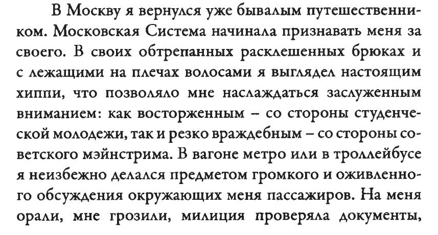 “I returned to Moscow as an experienced traveler. The Moscow System was beginning to accept me as one of their own. In my worn-out flared trousers and with my hair falling over my shoulders, I looked like a true hippie, which allowed me to enjoy well-deserved attention: enthusiastic from the student youth and sharply hostile from the Soviet mainstream. In the subway car or on a trolleybus, I inevitably became the subject of loud and lively discussion among passengers around me. People yelled at me, threatened me, the police checked my documents, street hooligans kicked me, slapped me in the face, and dragged me by my hair. But thanks to that, I felt like a lone hero, bravely resisting the soulless machine of oppression. Narcissism and pride completely took hold of me. At school, I felt like an ugly duckling. Now I have become… no, not a swan, of course, but probably a peacock. A stupid, vain, self-loving peacock. I delighted in myself and my newfound popularity.” 1