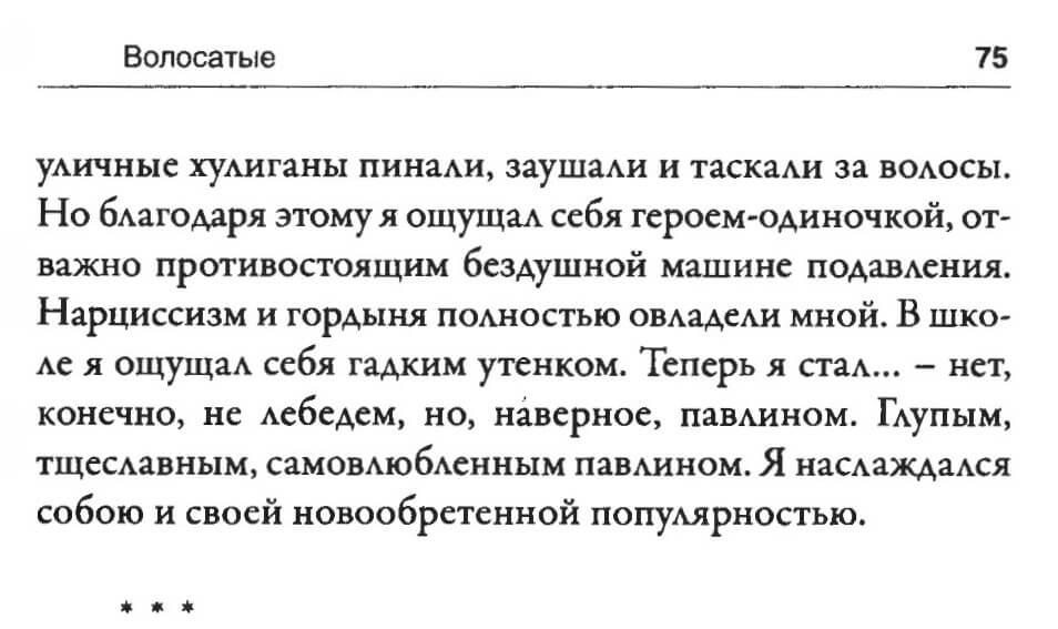 “My father, contrary to the lieutenant colonel’s confidence, was not a ‘commander in chief,’ so I had to get a haircut. As my locks fell to the floor under the barber’s hand, I felt strength draining out of me. I left the barbershop demoted from general to private. Now I again merged with the crowd and stood out in no way. No one stared at me anymore or turned to look. Even acquaintances on the Street stopped recognizing me. I took out my photograph with hair lying on my shoulders, showed it to everyone, and said it was a forced measure. Acquaintances politely sympathized and moved on. It was me who cast myself out of the hippie brotherhood!