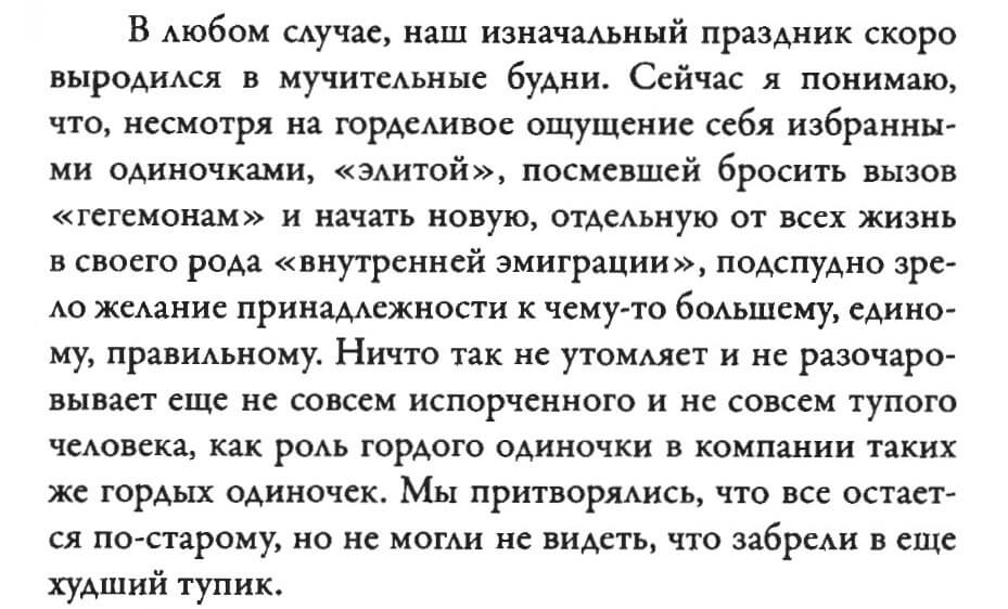 “Anyway, our initial festivity soon turned into a painful routine. Now I understand that, despite our proud sense of being chosen loners, an ‘elite’ who dared to challenge the ‘hegemons’ and start a new life, separate from everyone else, in a kind of ‘internal emigration,’ there was a latent desire to belong to something bigger, united, and right. There is nothing more tiring and disappointing for a person who is not yet completely corrupted and not entirely stupid than the role of a proud loner in the company of equally proud loners. We pretended that everything was the same as before, but we couldn’t help but see that we had wandered into an even worse dead end.” 1