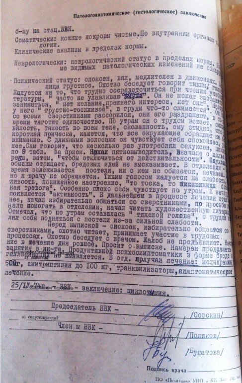 “January 20, 1977. In response to your inquiry, we inform you that A. L. Dvorkin, born in 1955, residing at… has been under observation at the dispensary for a neuropsychiatric disorder in the form of cyclothymia.