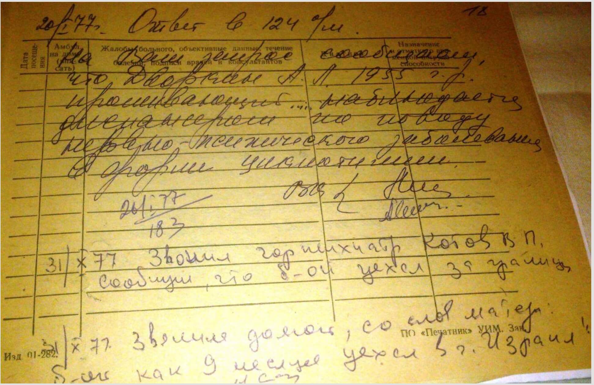 31 October 1977. The city psychiatrist, V. P. Kotov, called. He reported that the patient had left the country.